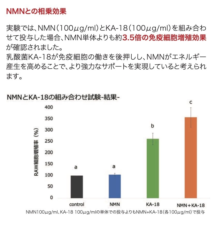 乳酸菌KA-18が免疫細胞の働きを後押しし、NMNがエネルギー産生を高めることで、より強力なサポートを実現していると考えられます。