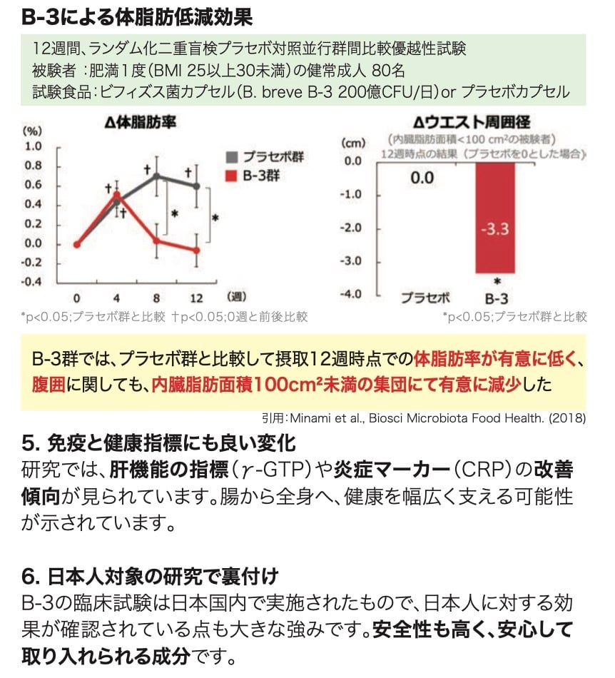 日本で長年研究されており、腸内環境の改善だけでなく、体脂肪や内臓脂肪の減少、 ウエスト周囲径の低下といった体組成の改善効果が臨床試験で確認されています。